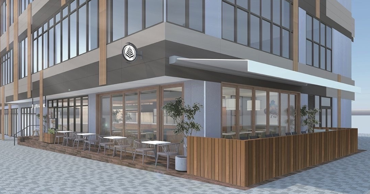 マンション敷地内にある商業ビルの1階にLATTE GRAPHIC、2階3階にはヨガスタジオ・ボルタリング施設・保育園などが入っています。