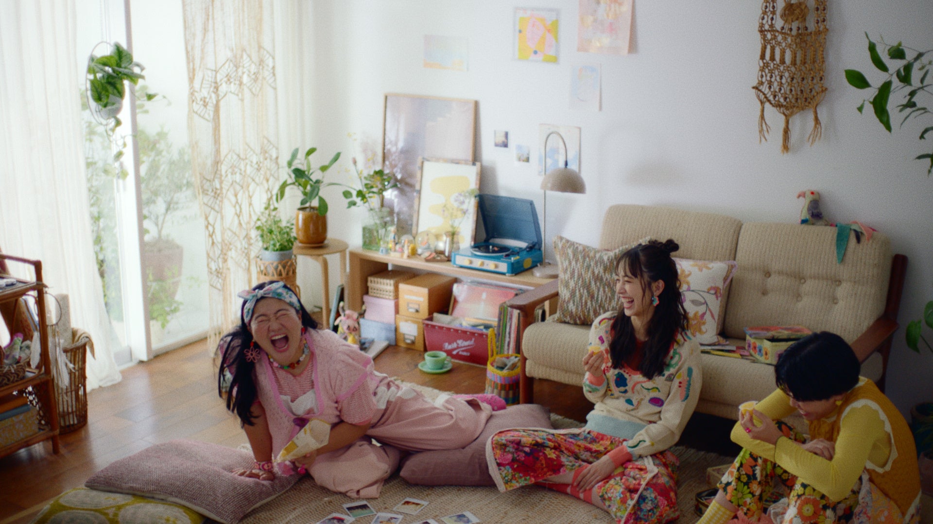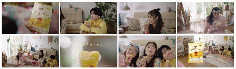 リビングやお庭で、お友だち同士でくつろぐリラックスした雰囲気の中で、楽しくおしゃべりしながら「蒟蒻畑 For Gourmet(フォーグルメ)」を味わう3人。何度でも観たくなるようなオシャレでハッピーな世界観のCMで、グルメなひとつぶがお届けする、おいしい幸せを描きます。