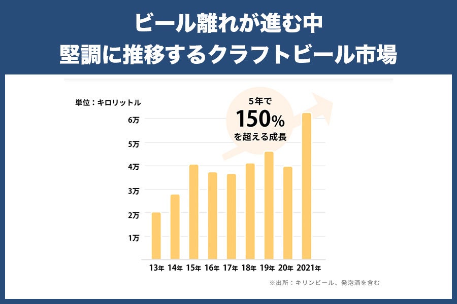 国内のクラフトビール市場規模は、2017年から2021年までの5年で150%を超える成長を誇っており、継続的かつ堅調に推移しております。
