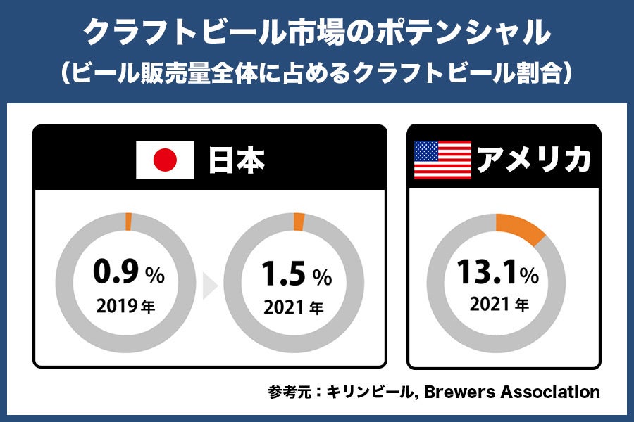 また、クラフトビール先進国のアメリカにおける市場規模は2021年時点で13.1%。