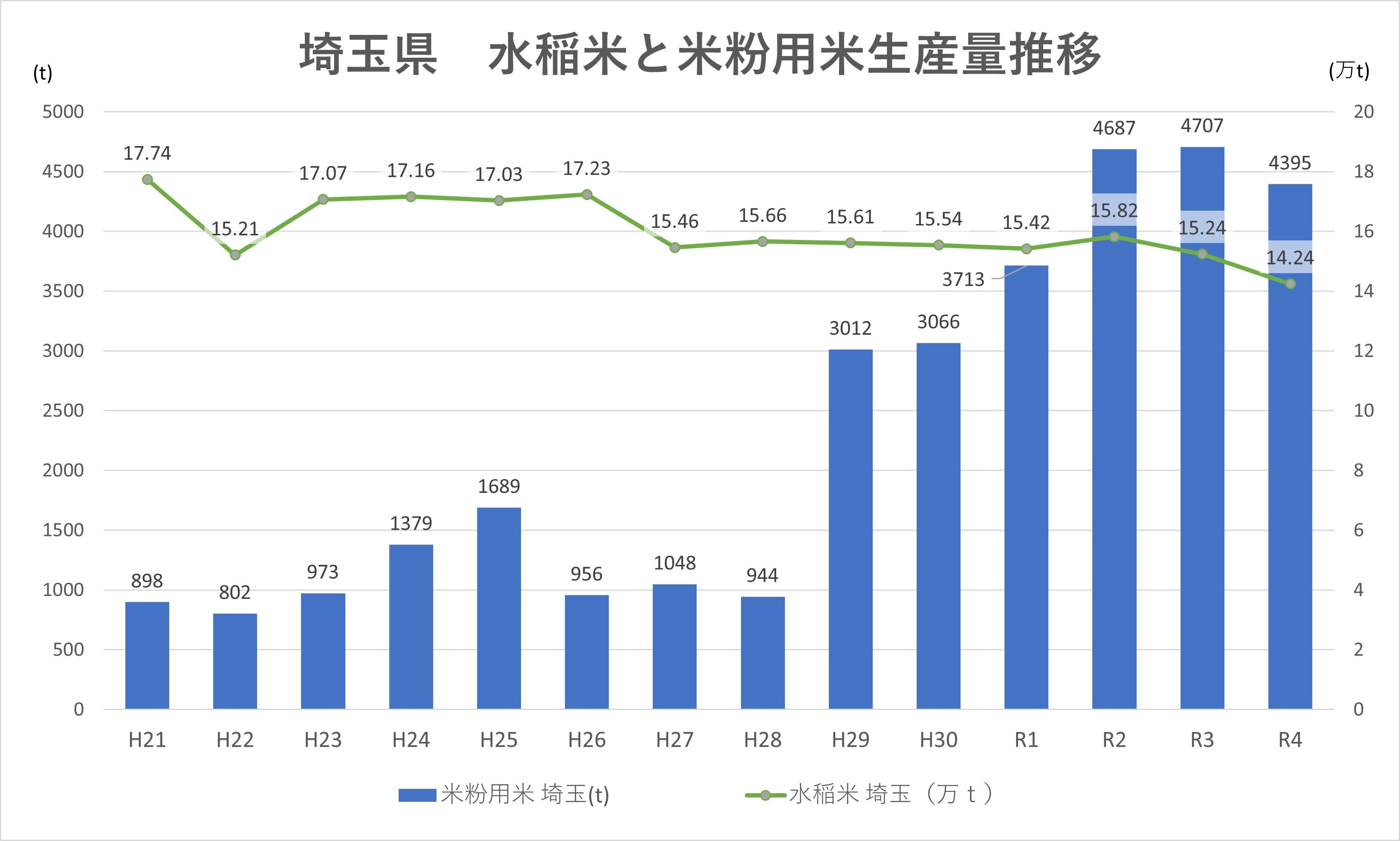 埼玉県の水稲生産量は平成21年より年々減少傾向にありますが、一方で米粉用米は同期間で約500%も増加しています。