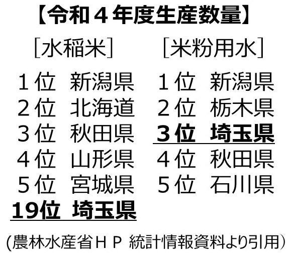 令和4年度の埼玉県の水稲米生産量は14.24万tで全国19位の生産数量となっています。水稲生産量の上位は、伝統的な米どころとされる都道府県が占める中、埼玉県は米粉用米生産量の面では3位に位置しています。