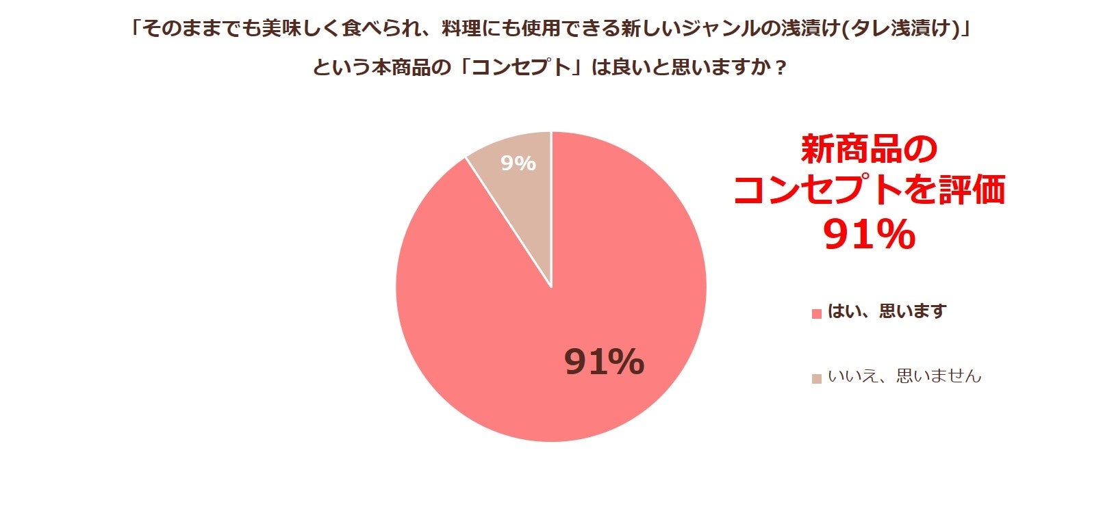 テストモニターに参加した100名を対象としたアンケートでは、新商品のコンセプトである「そのままでも美味しく食べられ、料理にも使用できる新しいジャンルの浅漬け(タレ浅漬け)」に対して、91%が「良いと思う」と回答し高評価が得られました。