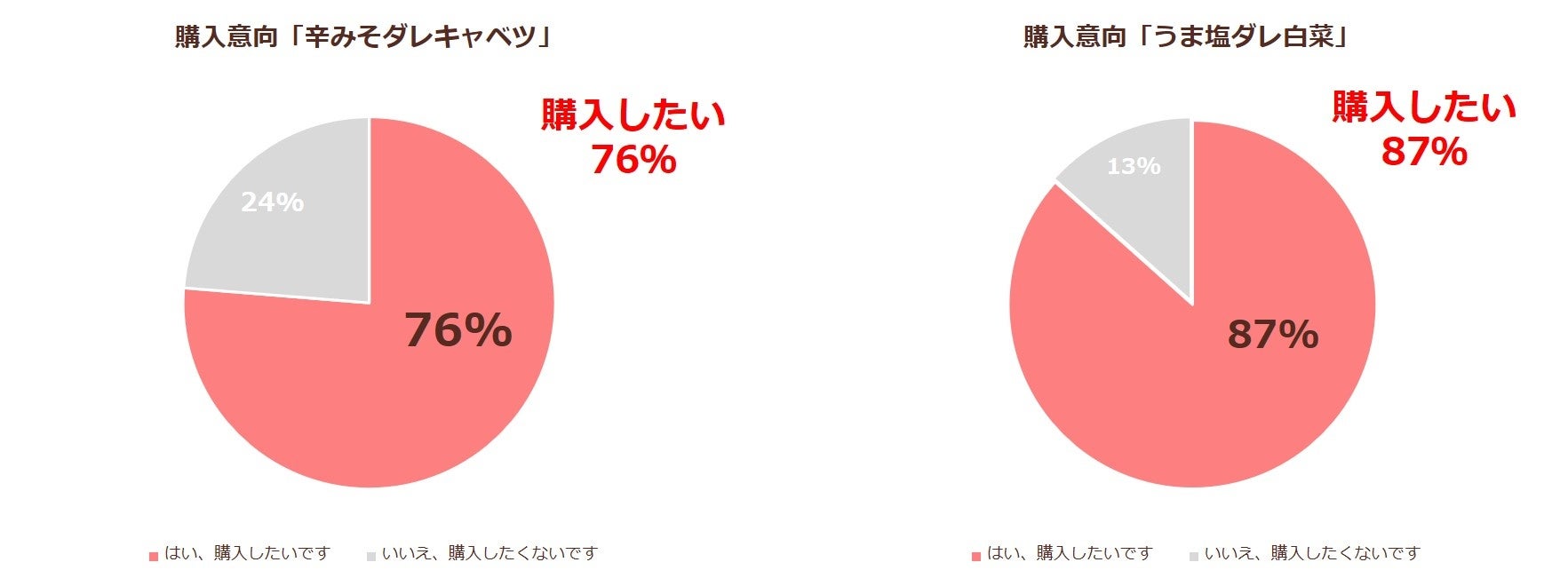 また、発売後の購入意向を聞いたところ、「辛みそダレキャベツ」は76%が、「うま塩ダレ白菜」は87%が「購入したい」と回答。その理由では、そのまま食べる美味しさや満足感はもちろん、調理にも使える汎用性や、料理に入れるだけで手間なく時短で味が決まり、野菜やタンパク質などの栄養が手軽に摂れる点、ご飯との相性や彩りもよく、家族が喜んで食べてくれる点などが多く挙がりました。