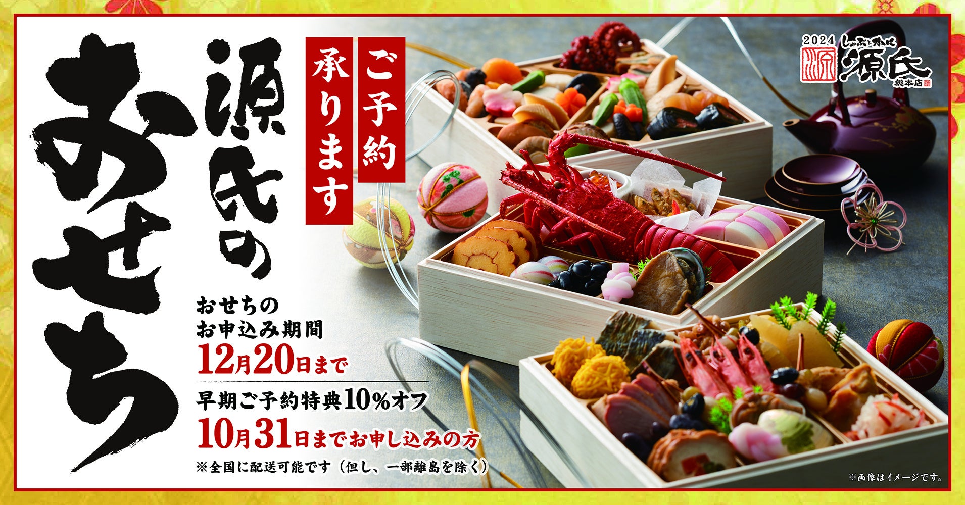 株式会社物語コーポレーション(本社:愛知県豊橋市/代表取締役社長:加藤 央之)が展開する『しゃぶとかに 源氏総本店 向山店』『しゃぶとかに 源氏総本店 南越谷店』は、2023年12月20日(水)まで、「源氏 伊勢海老おせち-三段重-」の予約をwebもしくは店頭、お電話にて承ります。