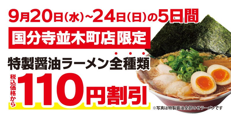 この度オープンを記念して、「国分寺並木町店」にご来店いただいたお客様には、『特製醤油ラーメン全種類』を税込価格から110円割引で販売いたします。