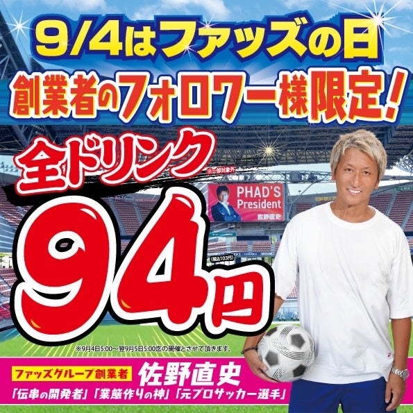 新時代の創業者である『佐野直史』の誕生日である串の日(9月4日)。新時代の名物『伝串』の累計販売本数は1億本を突破し、全国各地で人気急増中の居酒屋『新時代』。全国100店舗。全ての店舗が対象です。