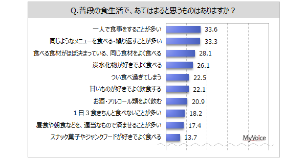 普段の食生活であてはまると思うものを選んでもらいました(複数回答)。「一人で食事をすることが多い」「同じようなメニューを食べる・繰り返すことが多い」が各3割強、「食べる食材がほぼ決まっている、同じ食材をよく食べる」が28.1%です。