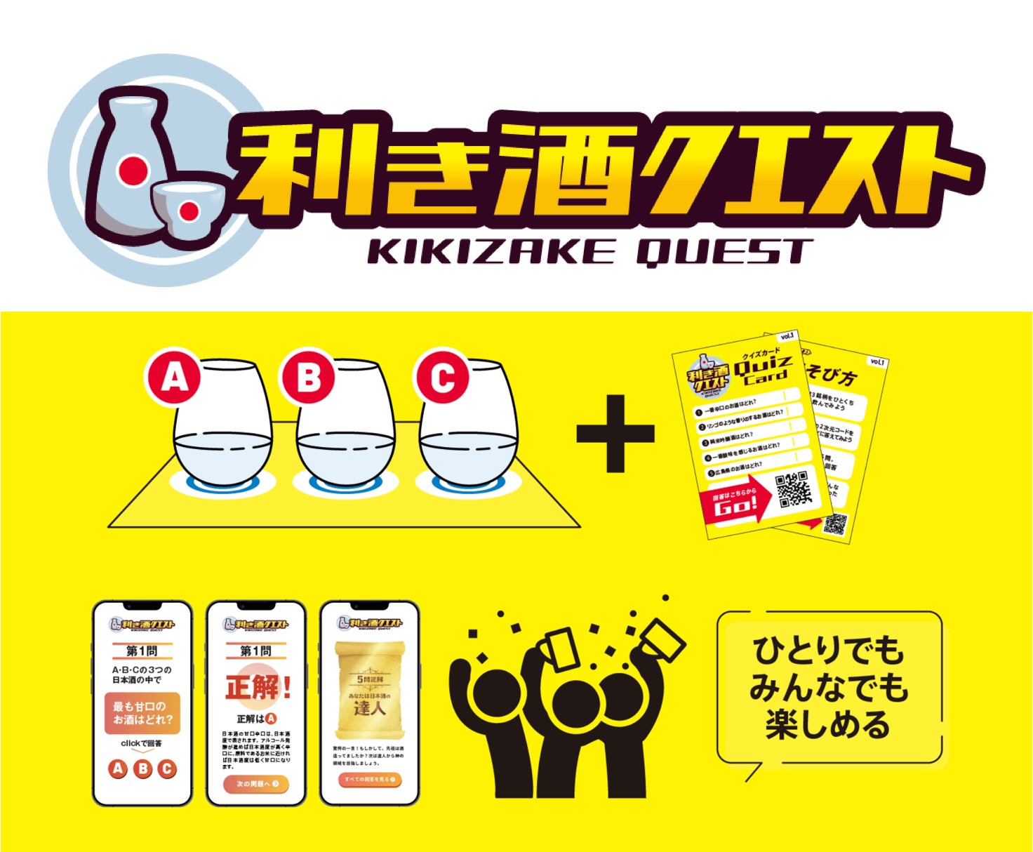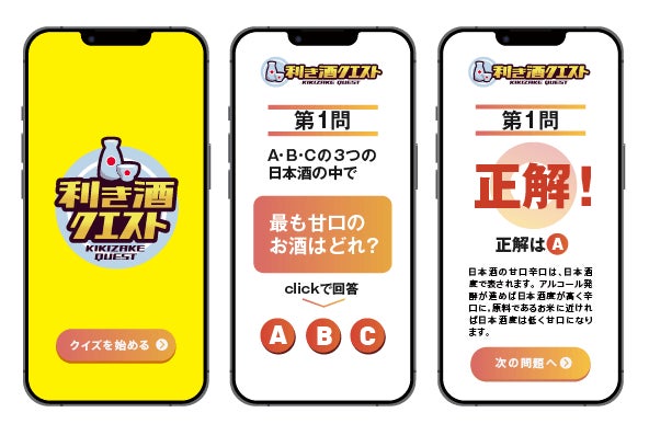 銘柄を隠して3つの日本酒を飲み比べ、スマーとフォンで味や香りに関するクイズに答えながら日本酒レベルを上げていく新感覚利き酒ゲームです。