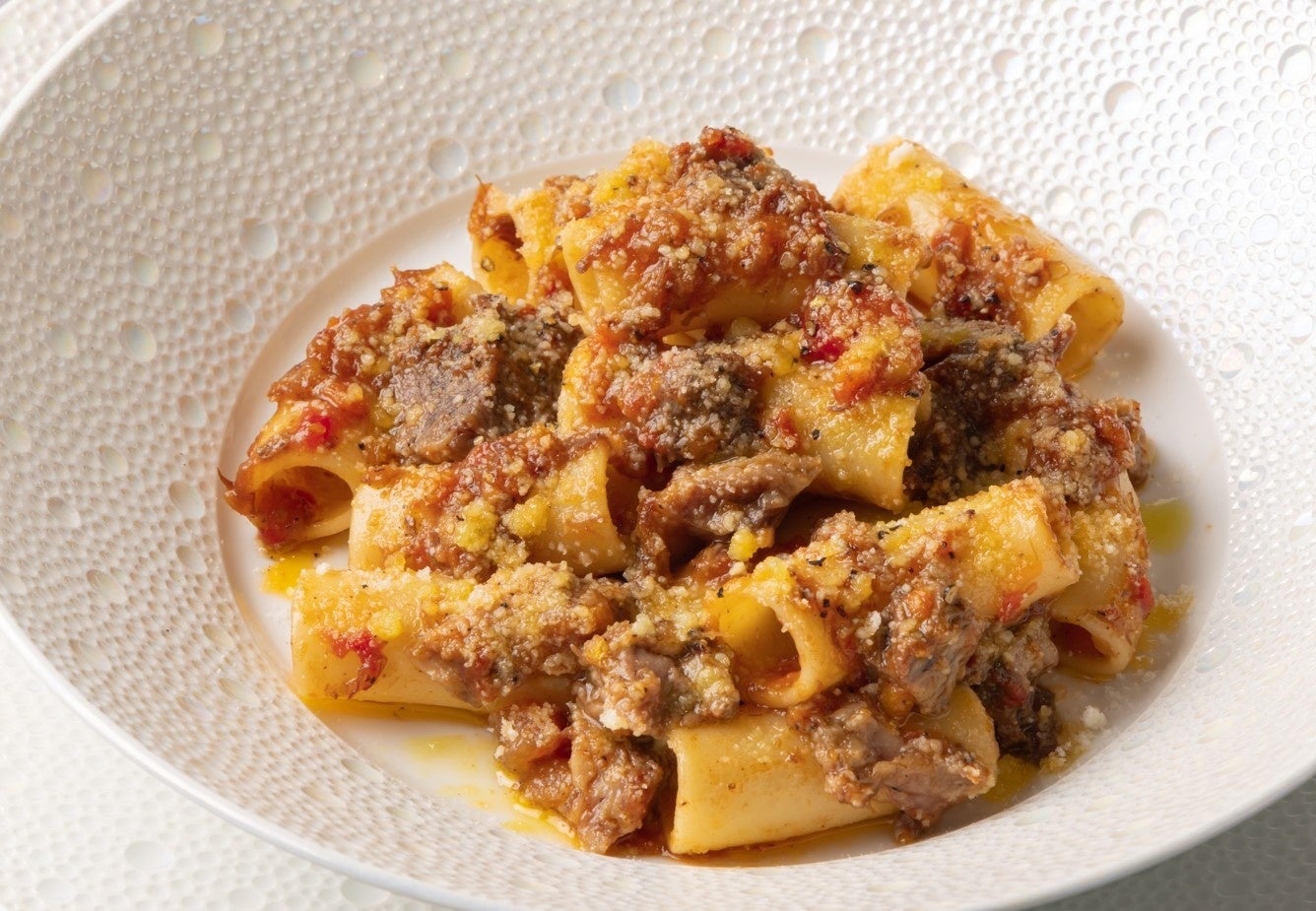 国産牛スネ肉の塊を筋がトロトロになるまで煮込んだラグーソース。香味野菜と牛肉の甘みが引き出されており、もちっとした食感の筒状のショートパスタとの相性抜群です。