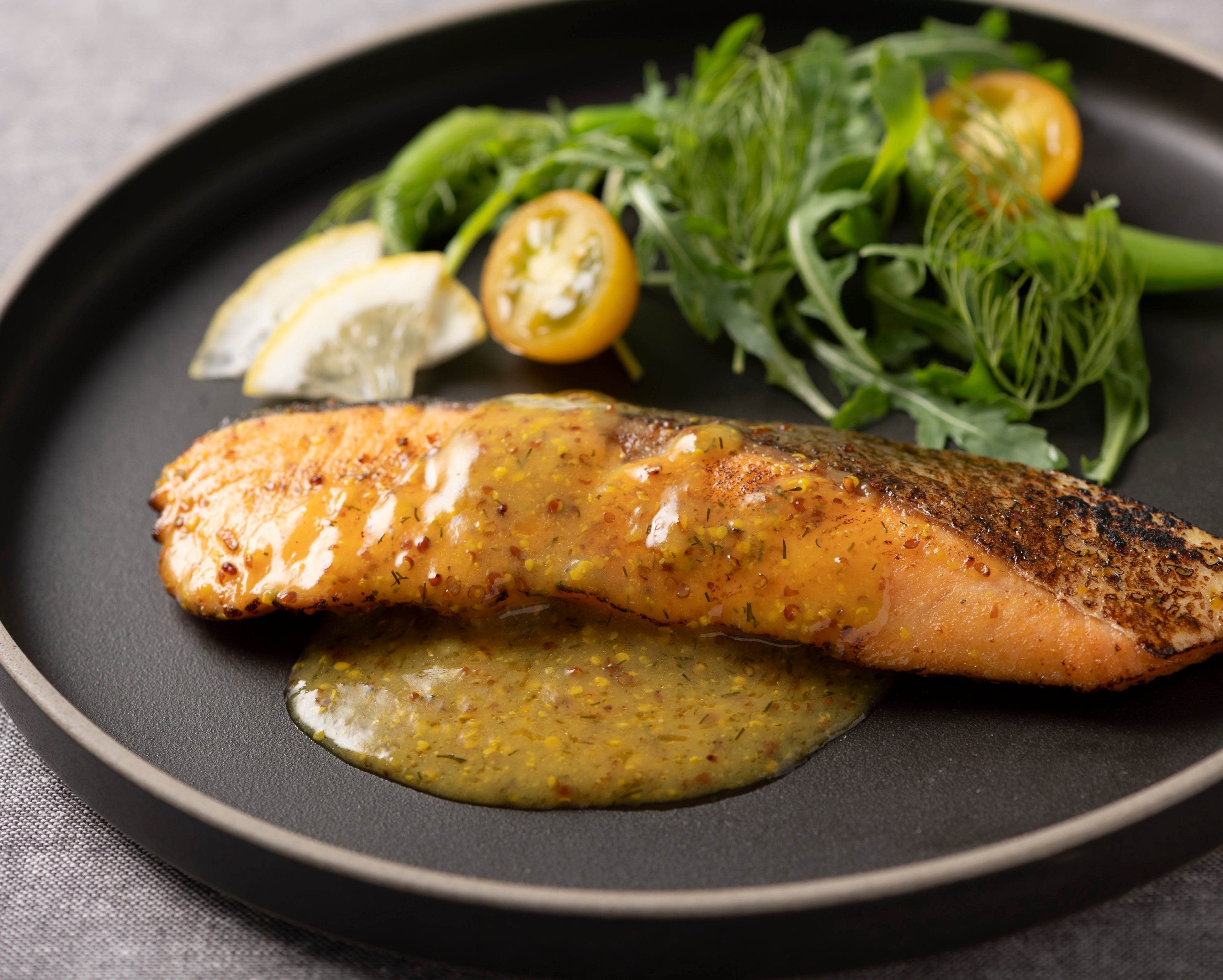 元大使館シェフがレシピを開発しました。脂の乗ったサーモンとマスタード風味のソースがピッタリ。丁寧に骨抜きがされているのも嬉しいところです。