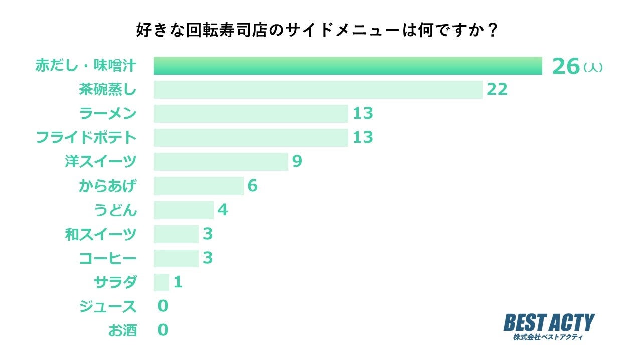 好きな回転寿司店のサイドメニューについて100人にアンケートを行ったところ、「赤だし・味噌汁」と回答する人が最も多い結果となりました。