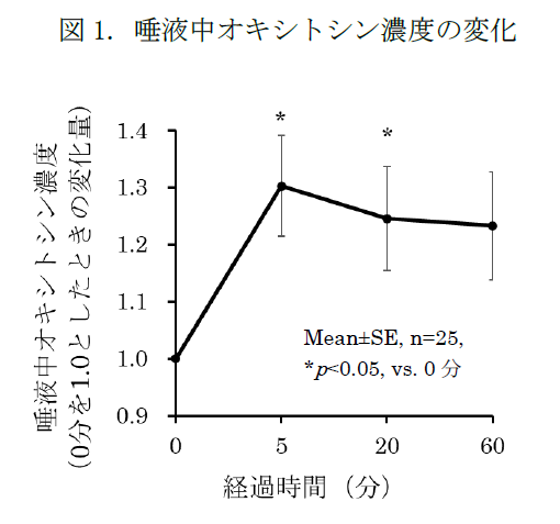 ②摂取前と摂取から5, 20, 60分後に唾液採取し、唾液中オキシトシン濃度の変化を調べました。