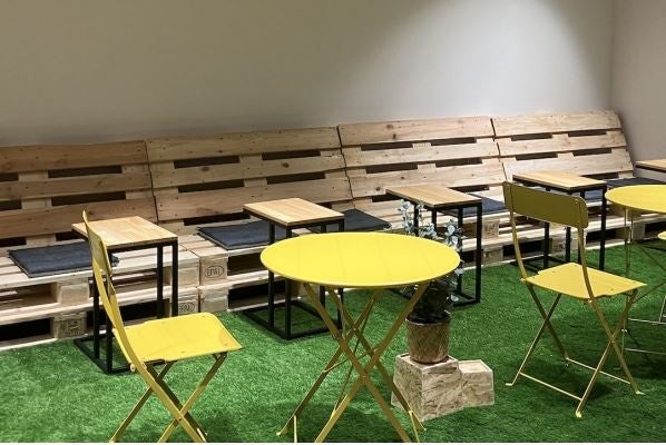 会場には芝生が広がる開放的な空間にベンチや黄色のガーデンテーブルを設置。