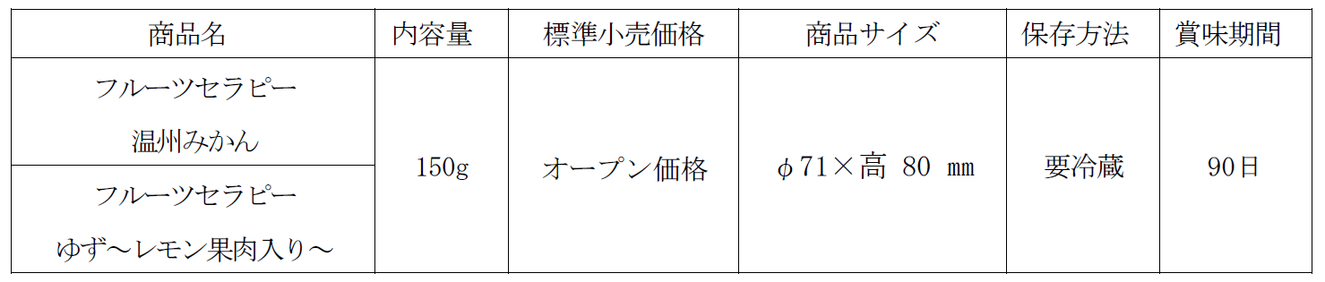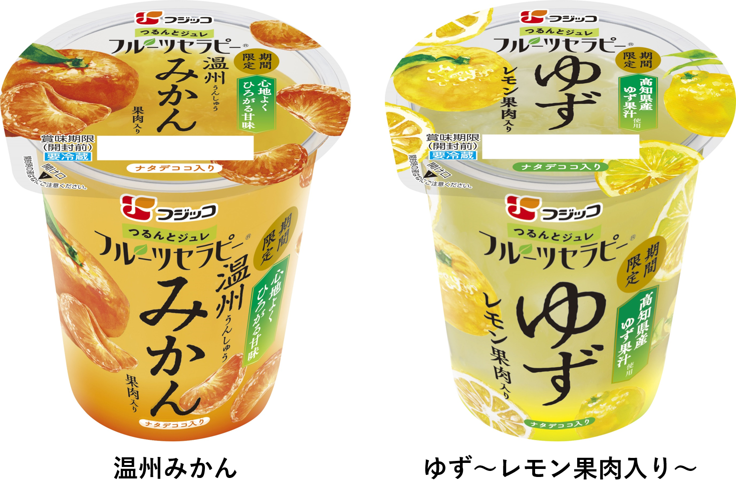 フジッコ株式会社(本社:神戸市中央区/代表取締役社長執行役員:福井正一)は、フルーツ本来の香りと味わいにこだわり続け“ココロとカラダを癒やす”ヒーリング・デザートとして支持されている、フルーツゼリー(チルド)市場売上No.1ブランド「フルーツセラピー®」から、秋冬期間限定フレーバーとして「温州みかん」を2023年9月1日より、「ゆず~レモン果肉入り~」を11月上旬より再発売いたします。