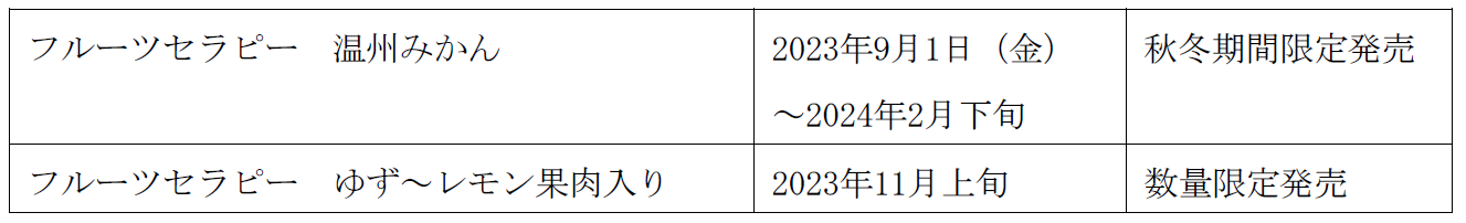 今年度も、昨年度お客様からご好評をいただきました2つのフレーバー「温州みかん」・「ゆず~レモン果肉入り~」を、秋冬期間・数量限定で再発売いたします。