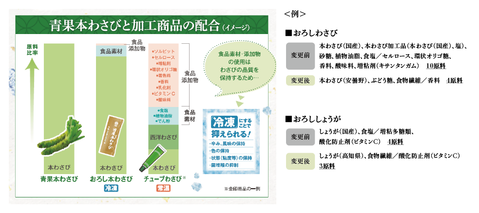 常温タイプのチューブわさびは手軽さやリーズナブルさが魅力です。しかし主原料となる素材は野菜であるため、価格を抑えつつ常温での長期保存を可能にするために主原料比率を抑え、主原料となるわさびは野菜であるため、常温で長期保存を可能にするためには主原料の使用を抑え、主原料以外の食品素材と食品添加物主体の配合となるのが一般的です。素材の味わいがより重要視される業務用市場では冷凍タイプが主流である一方、家庭用市場では価格や簡便性、保存性に優れた常温タイプが主流となっています。