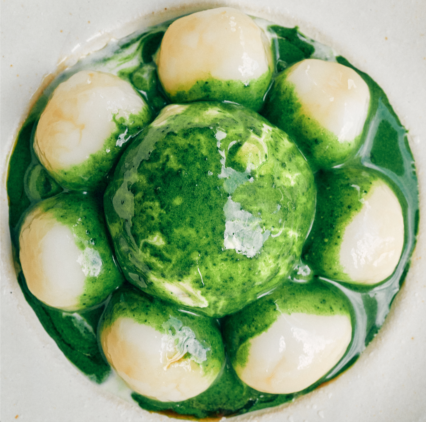 お客様自身で”和三盆仕立ての抹茶ソース”と”波照間産黒糖”を回しかけてお召し上がください。抹茶の苦味が黒糖と和三盆の甘みを引き立てます。まさに砂糖の本来の味わいを生かした白玉アイスです。白玉を黒糖と抹茶ソースに絡め、絶妙なバランスをご堪能ください。