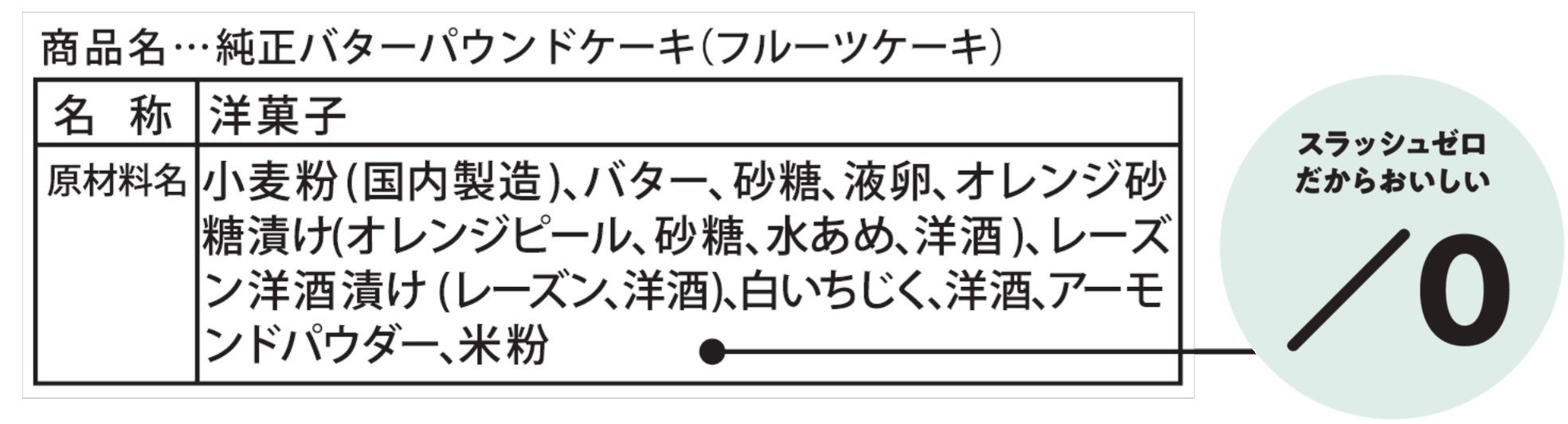 食品表示の「原材料名」に「/(スラッシュ)」がないこと。食品添加物を表記する場合は、「/」などで区切ることが一般的なルール。つまり「/0」は食品添加物が使われないことの証です。パッケージの裏をご覧ください。