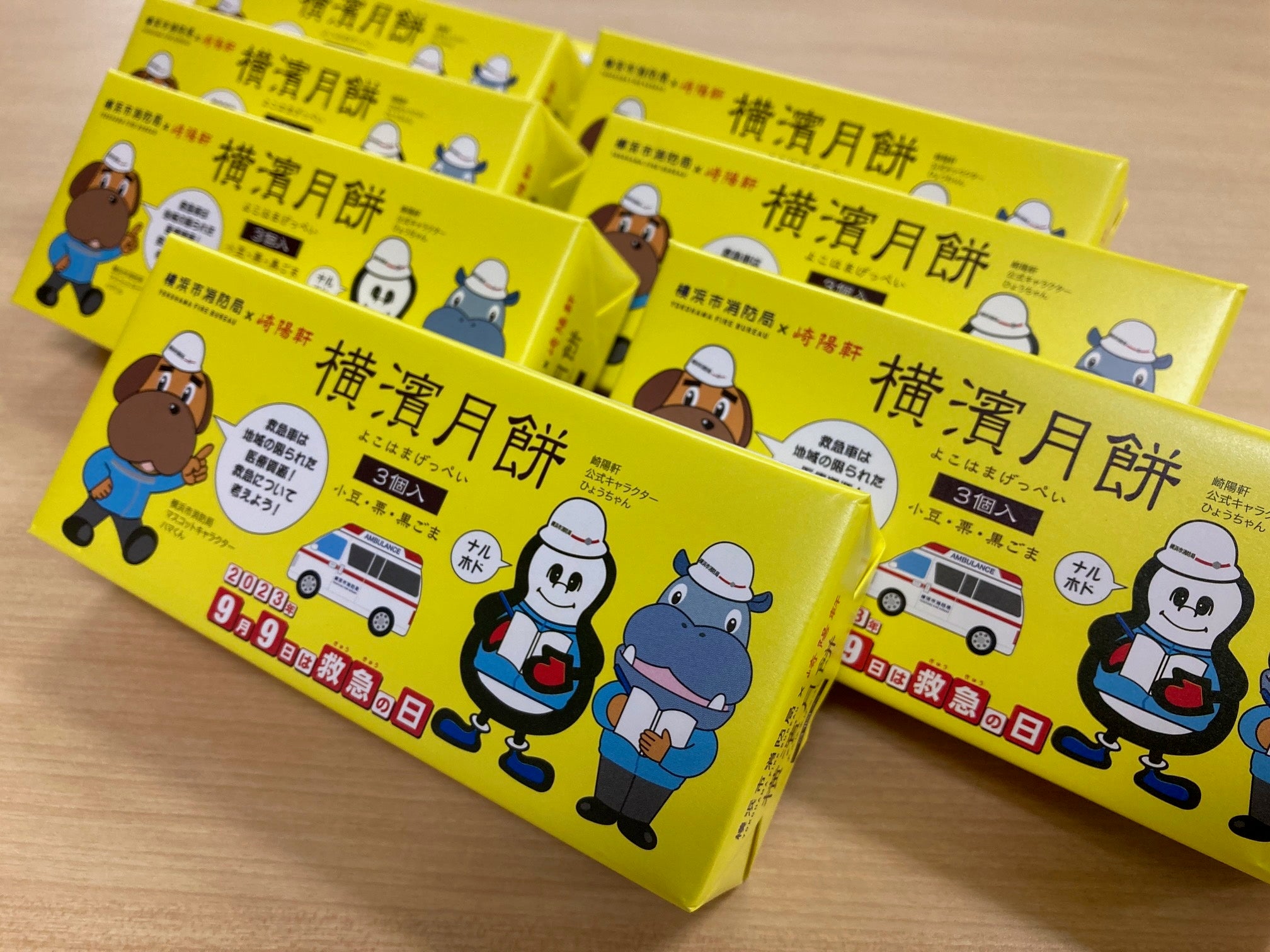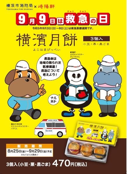 消防局では「救急の日」「救急医療週間」(※)を機に、「救急車の適正利用」「応急手当の重要性」などを考えていただくきっかけとなるよう、地元横浜のソウルフードを製造・販売している株式会社崎陽軒とコラボレーションし、昨年度に続き2度目となる「横浜市消防局×崎陽軒 9月9日は救急の日 横濱月餅 3個入」を発売します。