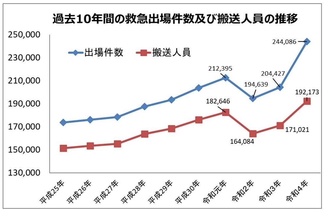 令和4年中の救急出場件数は244,086件で、前年と比べて39,659件(19.4%)増加し、搬送人員も192,173人で、前年と比べて21,152人(12.4%)増加し、いずれも過去最多を記録しました。