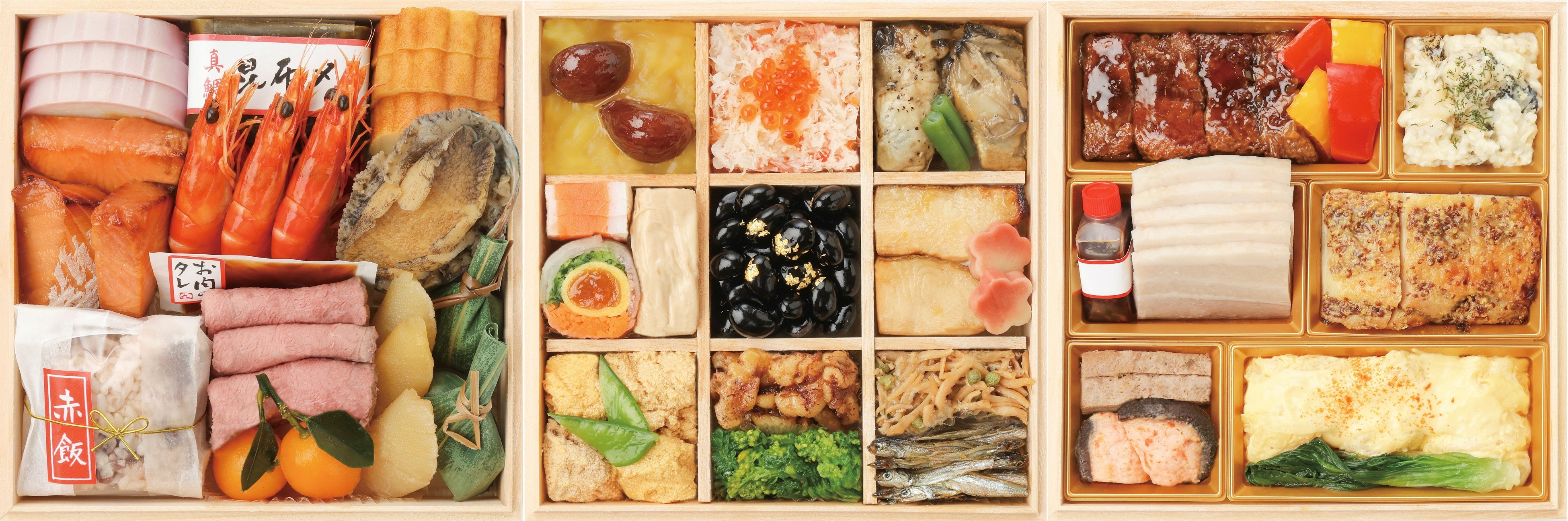 有平かまぼこ・真鯛昆布〆・伊達巻・キングサーモン西京焼・海老塩茹で・活けあわび煮・赤飯・ローストビーフ お肉のタレ付き・金柑・数の子美味漬・琥珀笹包み
