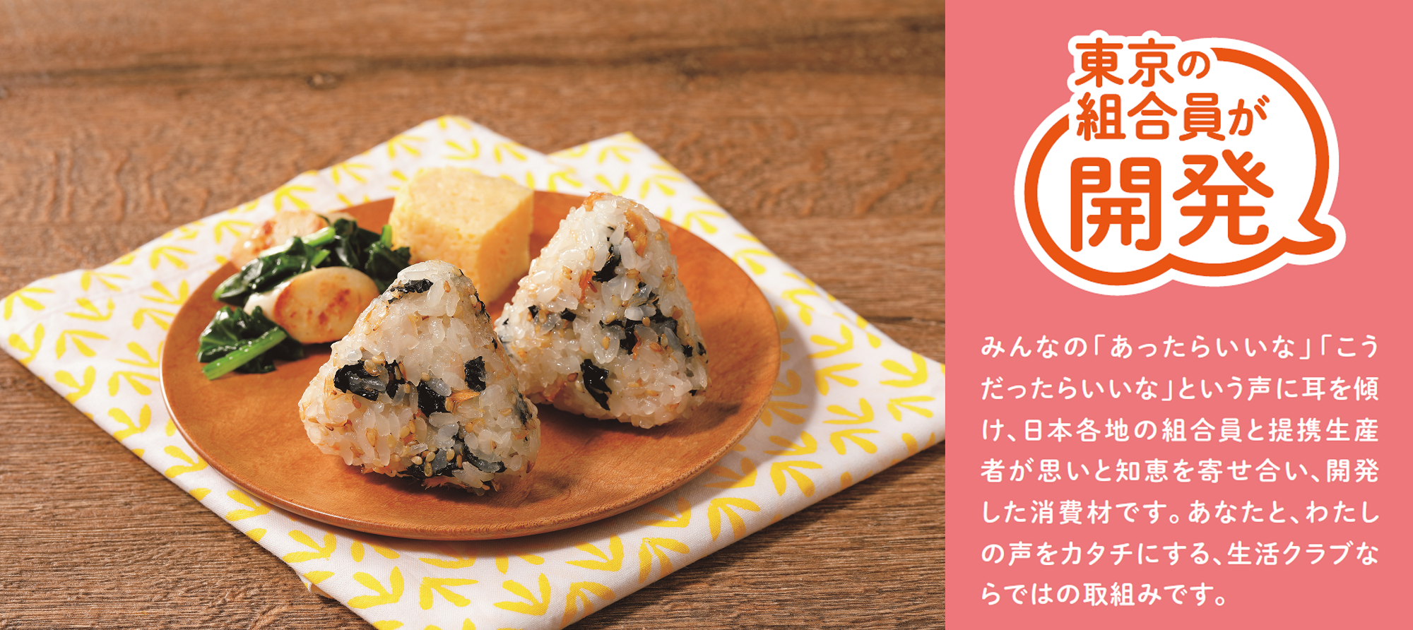 「多くの組合員に長く愛されるものとは?」市場調査や組合員に対するアンケートなどを実施し、徹底的に話しあいました。その結果、おやつやお弁当に使いやすい「冷凍おにぎり」の開発に決定。原料のお米には、生活クラブ東京と同じ関東圏で長年にわたり提携する、栃木県の生産者「JAなすの・どではら会」がつくる那須山麓米を使うことにしました。