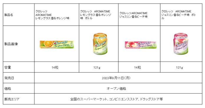 「クロレッツ AROMA TIME」は、「レモングラス香るオレンジ味」と「ジャスミン香るピーチ味」の2種類のフレーバー。アロマやハーブティーに使われるお馴染みのハーブ、レモングラスとジャスミンがフルーツフレーバーとマッチして新感覚のハーモニーが味わえます。「レモングラス香るオレンジ味」は、緑爽やかなレモングラスの香りと甘酸っぱいオレンジ味、「ジャスミン香るピーチ味」は、花の王をよばれるほど華やかなジャスミンの香りとまろやかな甘さをもつピーチ味をほどよくミックスしました。