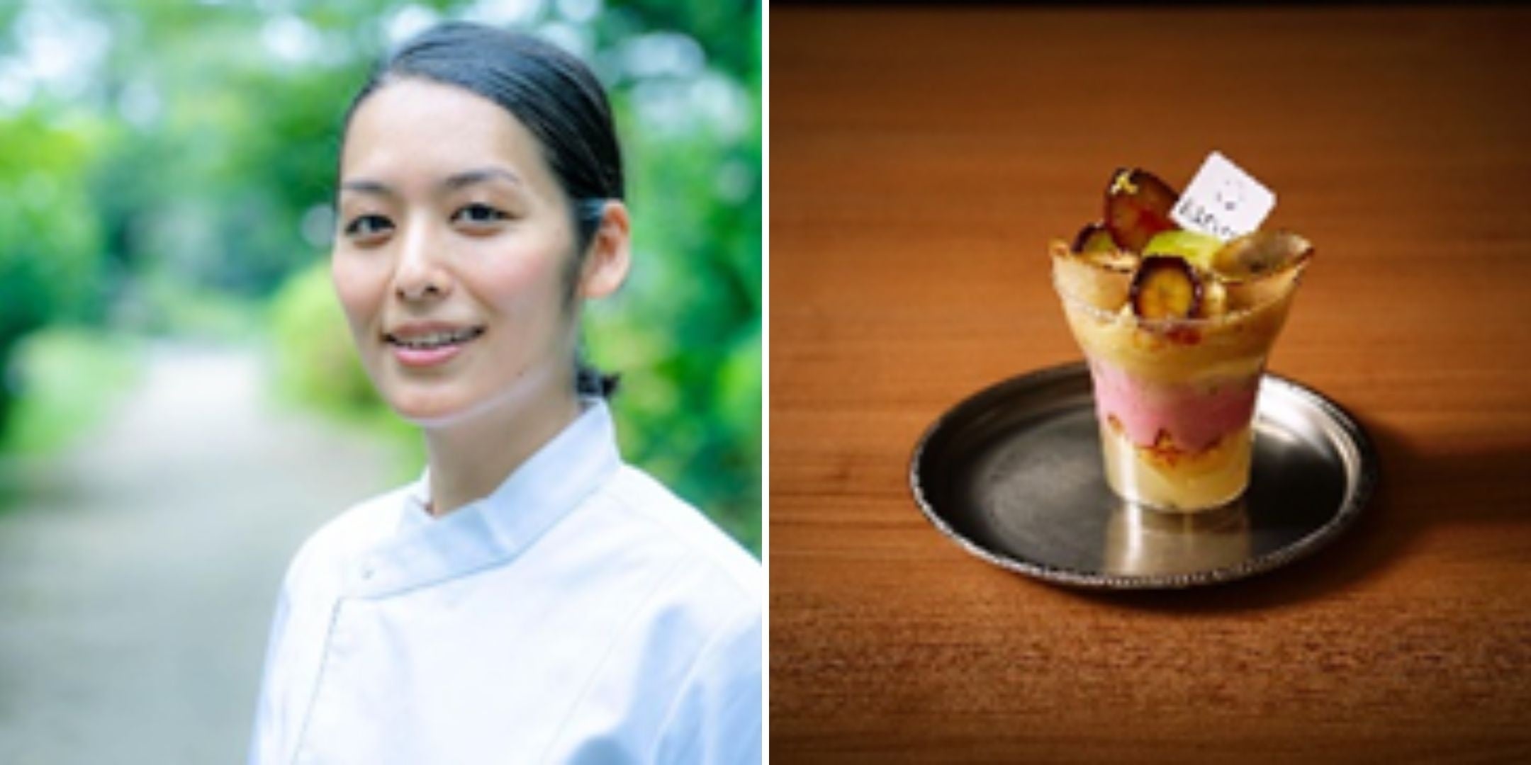 フレッシュの和梨から作ったジュレにサクサクのクランブル、巨峰の爽やかなムースと自家製栗の渋皮煮を使用した、EMMEのパフェのようなモンブラン。フレッシュの和梨と葡萄、シャインマスカットをあしらった贅沢な1杯。