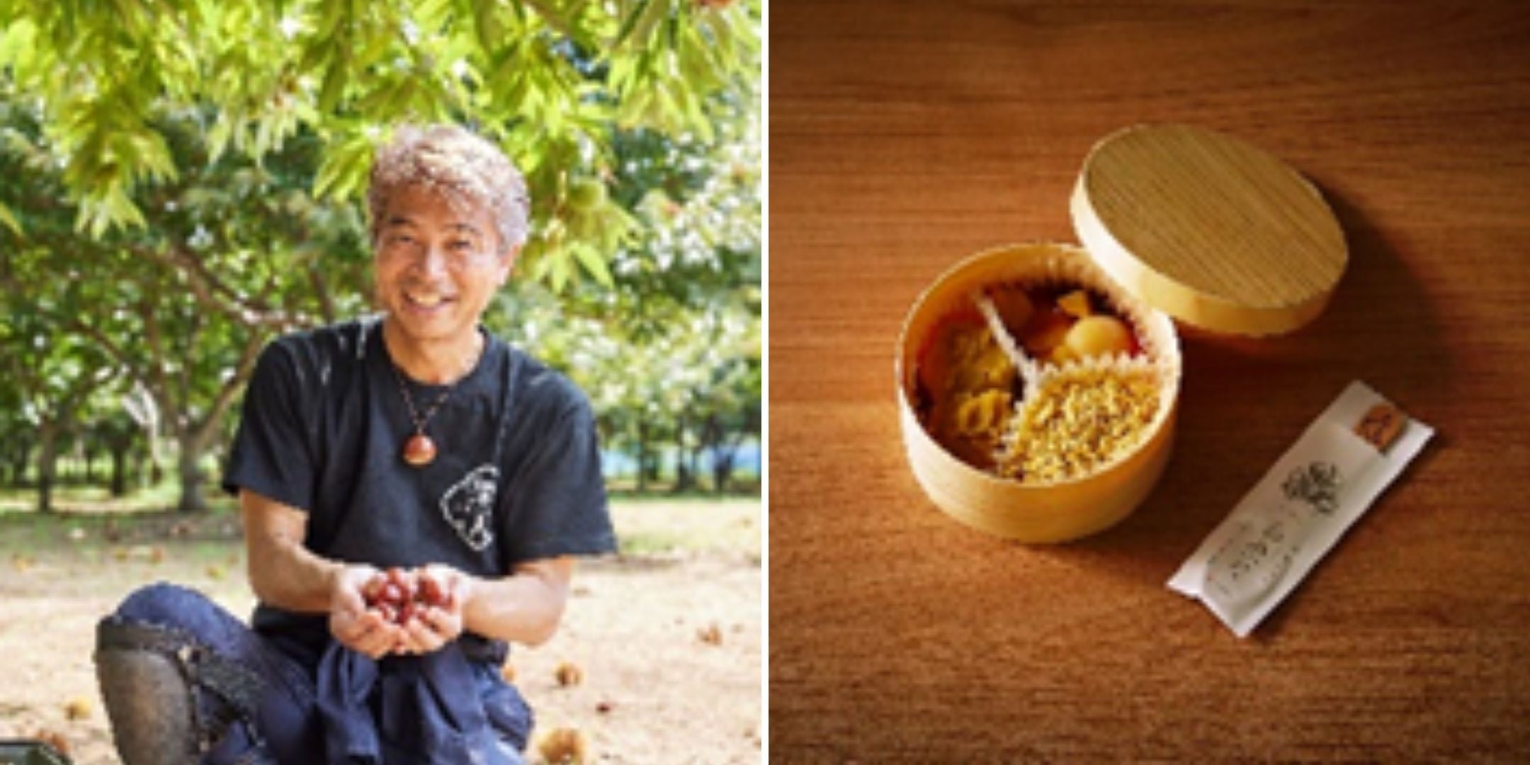 栗:日本一の栗産地、茨城県笠間にある自社農園および、週辺地域で栽培された厳選和栗のみを使用。白玉だんご:茨城県石岡の契約栽培米(農薬、化学肥料不使用)を自家製分したこだわりの白玉だんご。