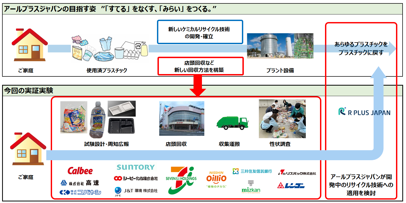 今回の回収実証実験では、2022年11月に千葉県東金市で1か月間実施した回収実証実験の結果を踏まえ、回収対象として新たに納豆容器・弁当容器を加え、期間を約3か月に延長して行い、アールプラスジャパンが開発中のケミカルリサイクル※技術への適用を検討いたします。