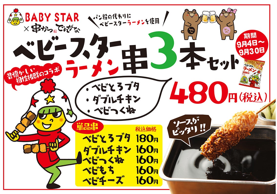 ・新商品「ベビとろブタ串」「ダブルチキン串」に大人気の復刻商品「ベビつくね串」を一度に楽しめる「ベビースターラーメン串3本セット」もおすすめです。是非、この機会に期間限定のコラボ串をお試しください。