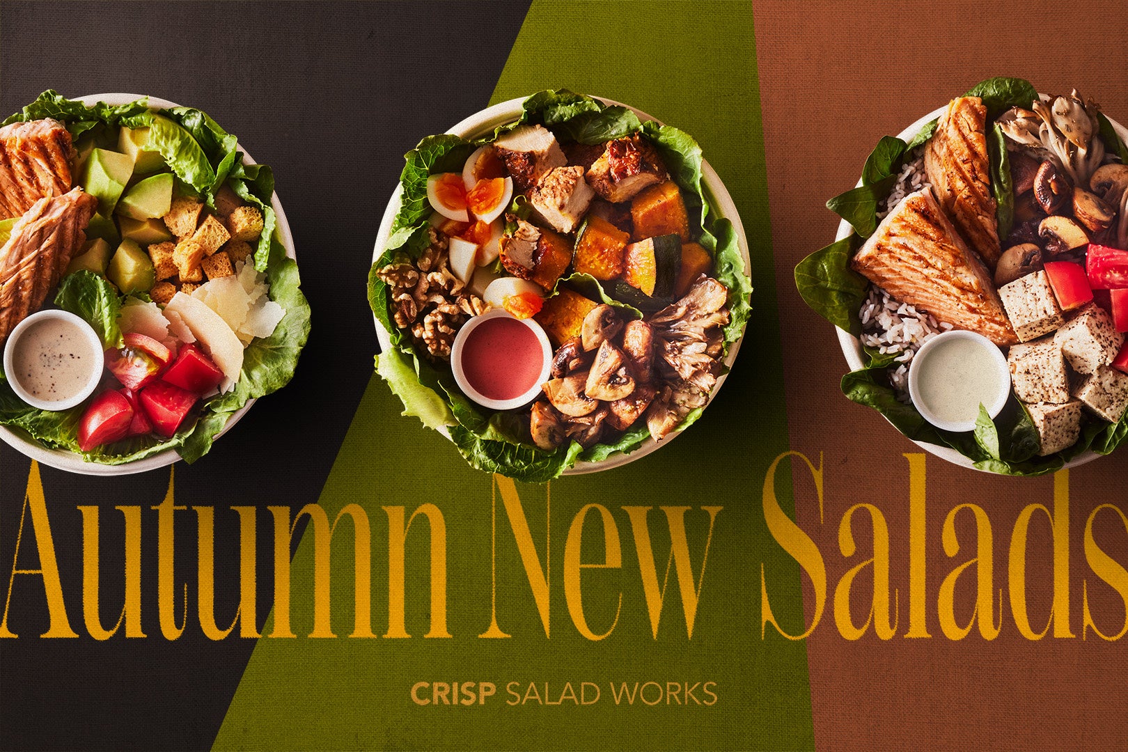 秋の味覚をたっぷりと、食材にあった組み合わせでシーズナルサラダをご用意しました。2022年11月から発売を開始した冬のシーズナルサラダから四季を一周する今期にお届けするのは、「オータムチキンコブ」「サーモンアボカドシーザー」「サーモンクリームボウル」の3種の秋らしいサラダとボウルです。