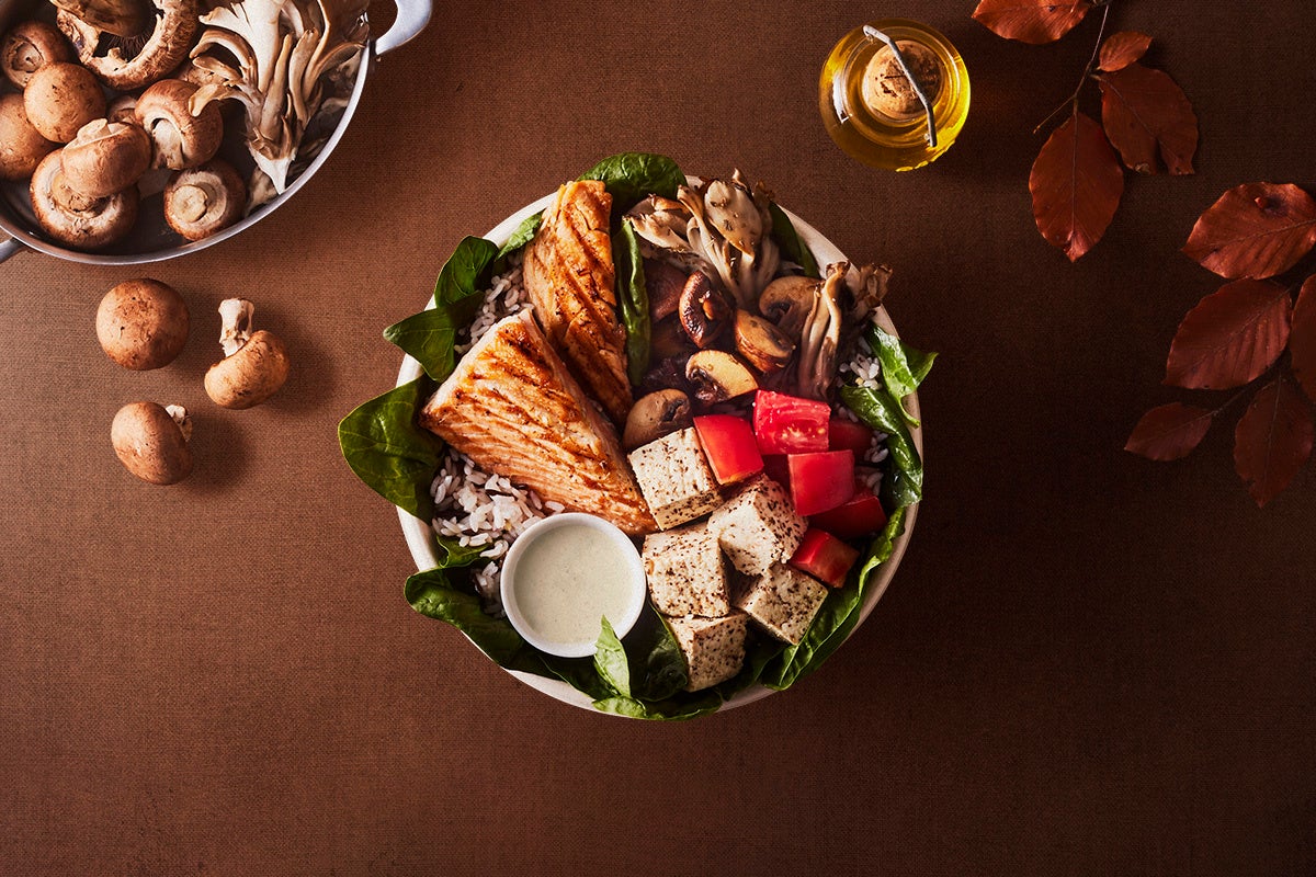 サーモン料理をぎゅっと1ボウルに詰め込んだようなワイルドライス入りの主食ボウル。秋の味覚と、トマト、ロースト豆腐をバターミルクランチでクリーミーに仕上げました。