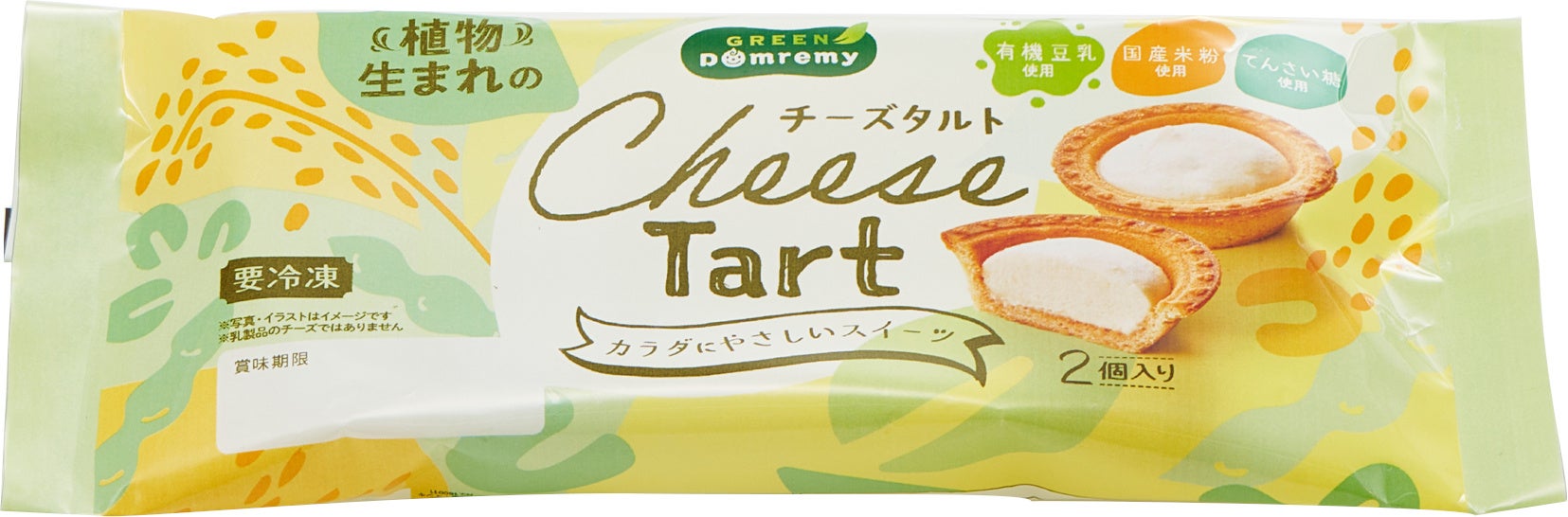 【特徴】卵、小麦粉を使用せず、米粉、てんさい糖、有機豆乳を配合しグルテンフリーのタルト生地に仕上げました。豆乳クリームや植物性クリームチーズをベースにてんさい糖やレモンを加え、乳味感、甘味、酸味をバランスよく仕上げ、