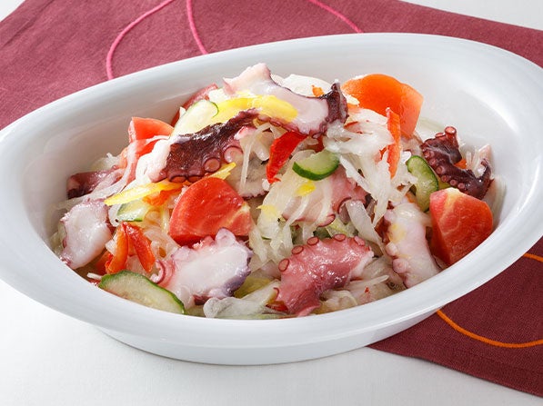 薄切りの真だことトマトなどの野菜をレモンドレッシングで和えたマリネサラダです。