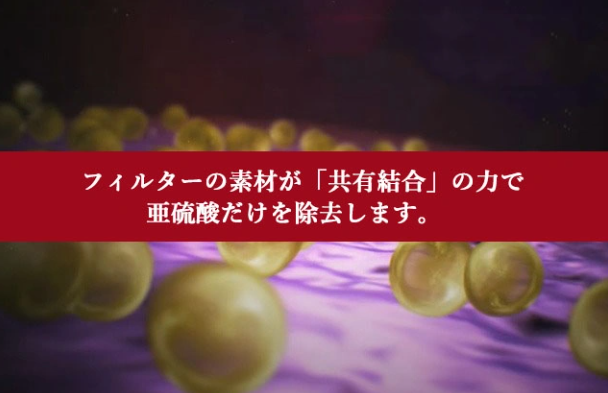 フィルターの素材が「共有結合」の力で亜硫酸だけを除去します。