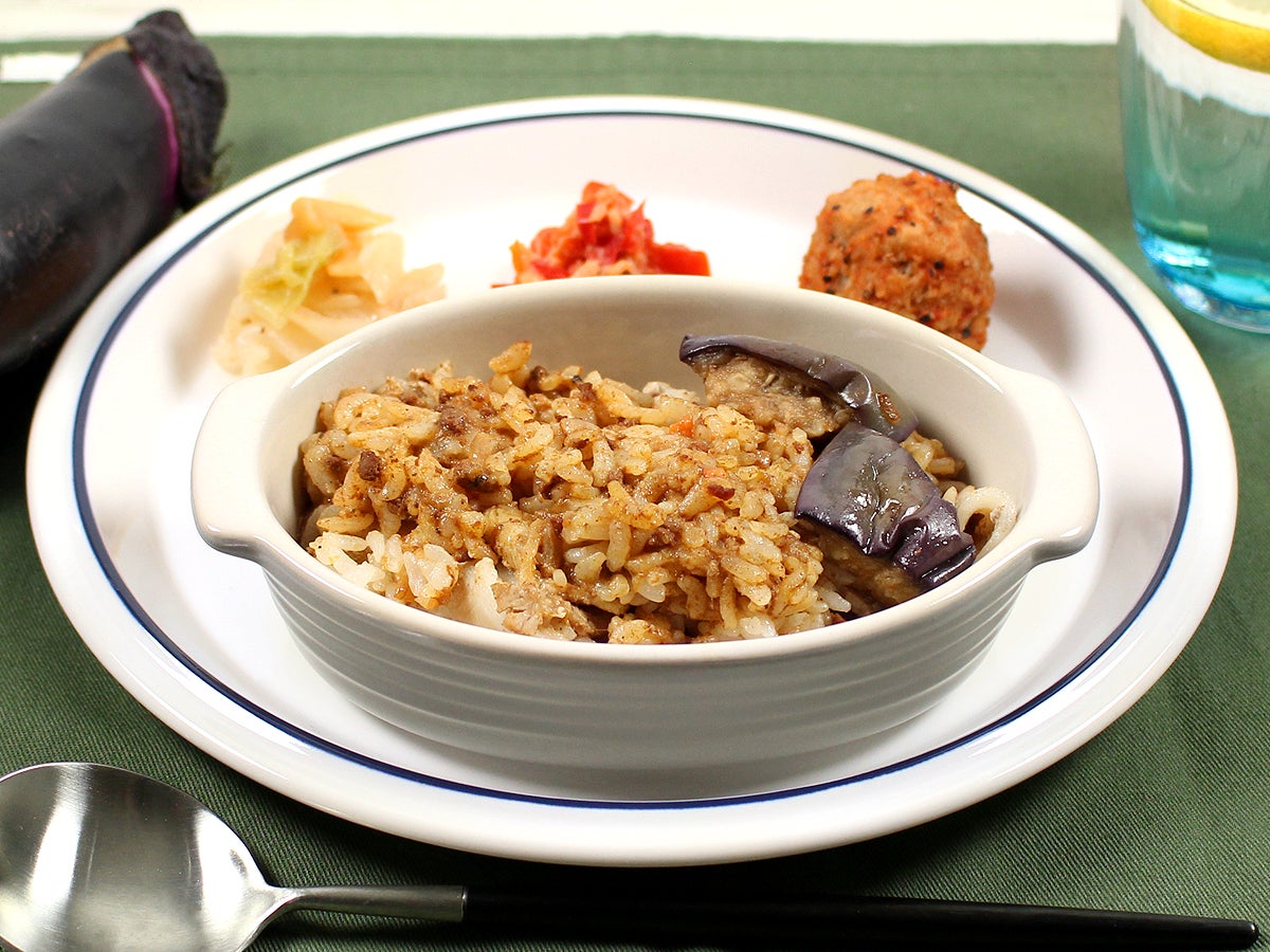 開けてびっくり、カレーがない!…ピラフの下に豚バラ肉と香辛料の効いたオリジナルのスパイスカレー、ちゃんと入っています!ピラフとお肉にこだわりのスパイスカレーをよく絡めて、お召し上がりください。揚げなすも添えております。