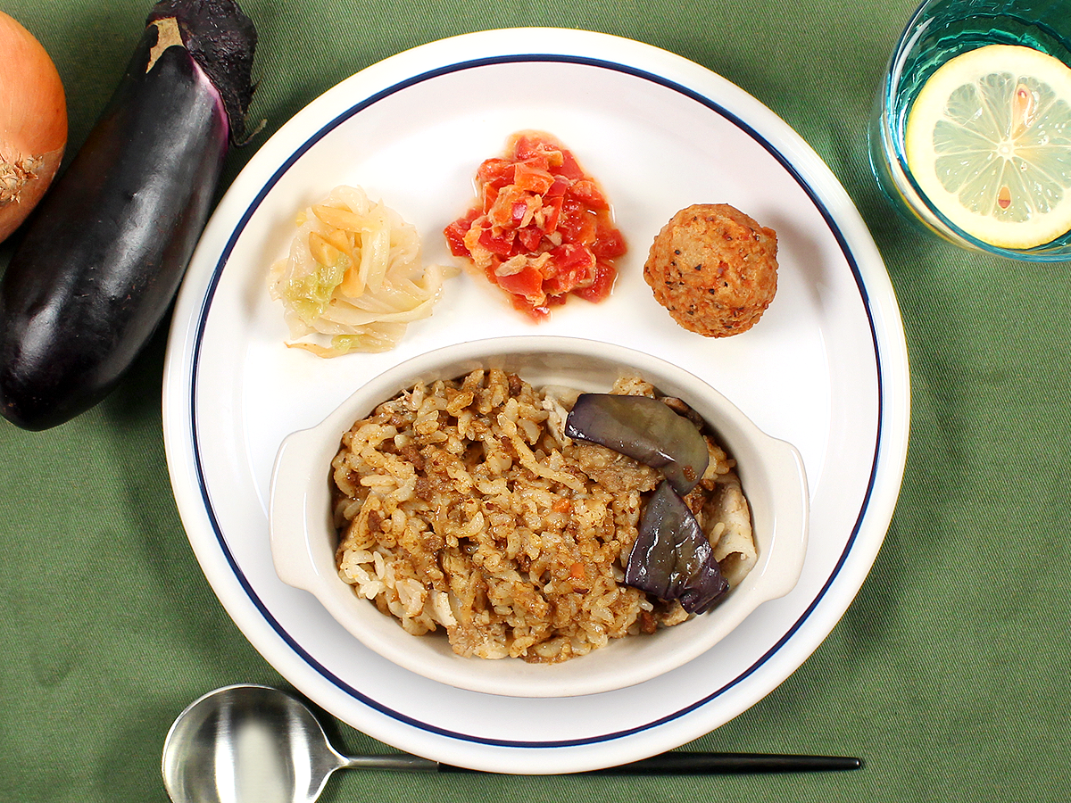 開けてびっくり、カレーがない!…ピラフの下に豚バラ肉と香辛料の効いたオリジナルのスパイスカレー、ちゃんと入っています!ピラフとお肉にこだわりのスパイスカレーをよく絡めて、お召し上がりください。揚げなすも添えております。