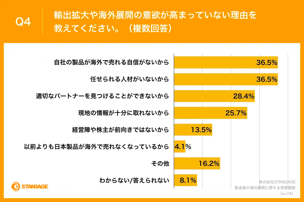 輸出に対して消極的/保守的になる理由として、「自社の製品が海外で売れる自信がない」や「任せられる人材がいない」などが挙げられており、海外展開に対して高いハードルを感じている実態が伺えます。