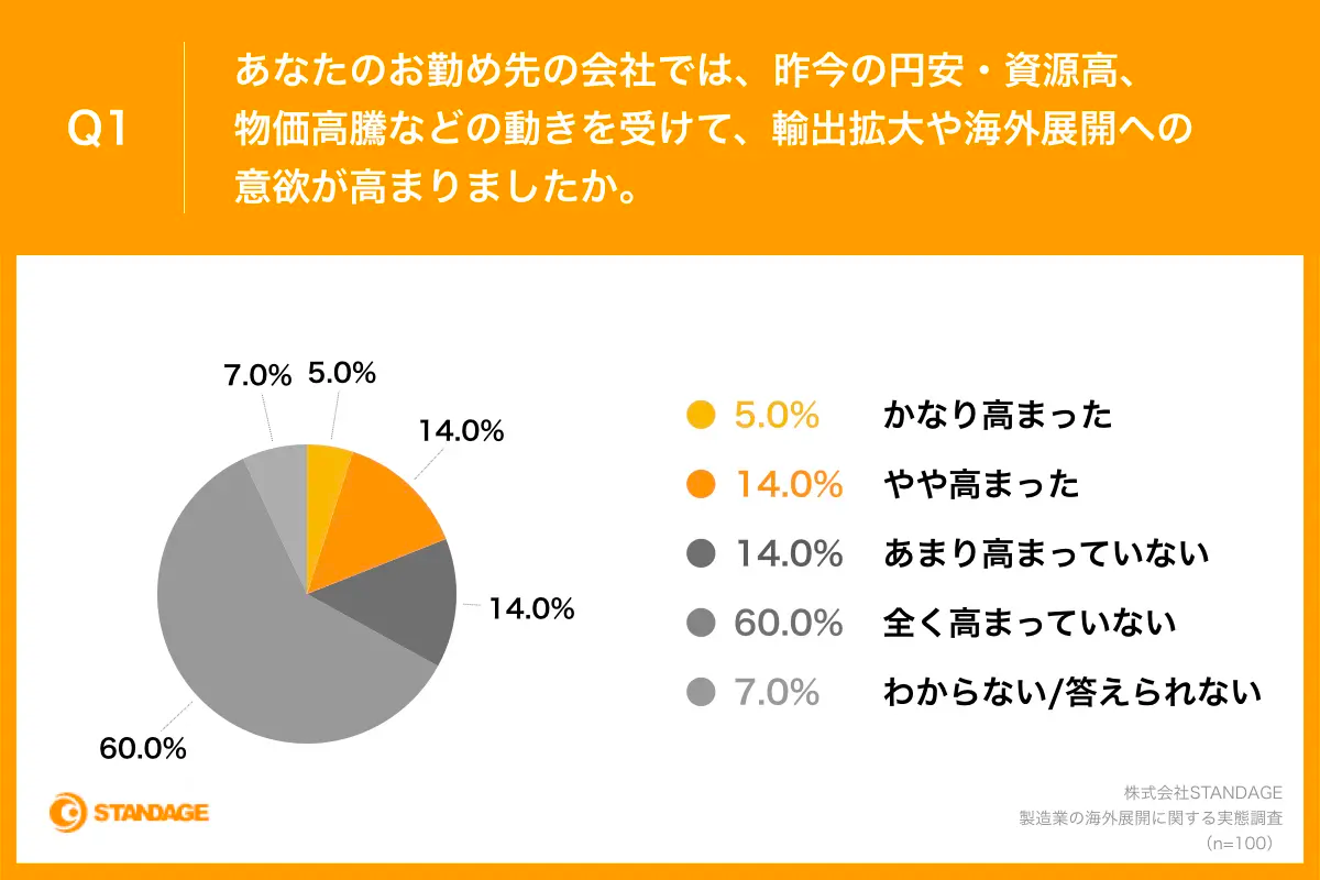 しかし、中小企業の輸出高を都市部・地方部別に見ると、その格差はまだまだ大きく広がっています。当社が2023年1月に実施した調査※によると、昨今の円安・資源高、物価高騰などの動きを受けて、輸出拡大や海外展開への意欲が高まった企業はわずか19.0%の結果となりました。