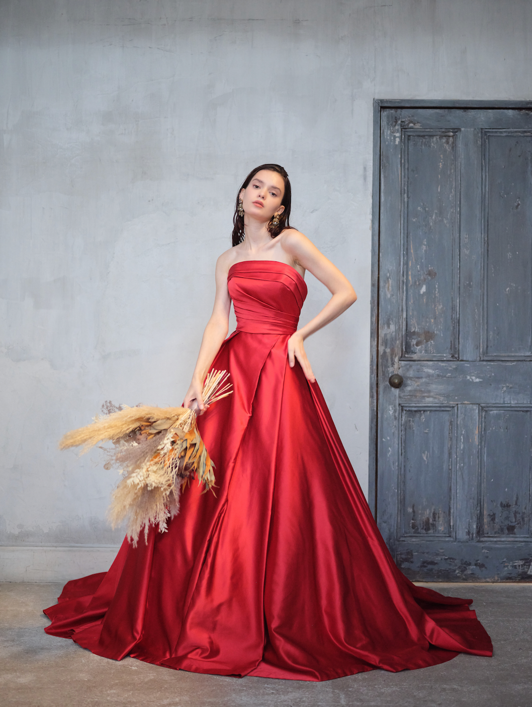 こっくりとしたカラーとシルクの光沢がドラマティックな一着。サテンとジャガードを組み合わせ都会的な大人の華やかさを感じさせます。