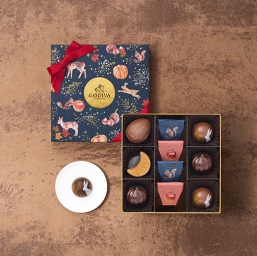 夜空に浮かぶ美しい月の下、秋の味覚を楽しむ森の動物たちをイメージしたパッケージに、季節を彩る食材を使った限定チョコレートを詰め合わせました。