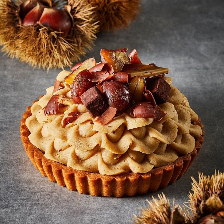 クリーム、ジェノワーズ、タルトの各パーツに栗を使用したモンブラン風味のタルト。