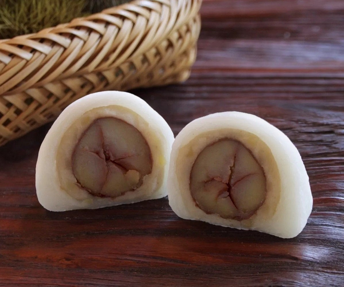 やわらかなお餅に渋皮栗をまるごと一粒。渋皮栗は栗のダイスカット入りの栗餡で包まれています。
