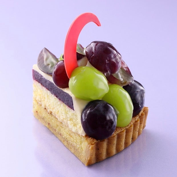 巨峰、シャインマスカット、赤ぶどう、白ぶどうの4種を飾りました。果肉のジュレでぶどうの甘みと酸味が溢れます。