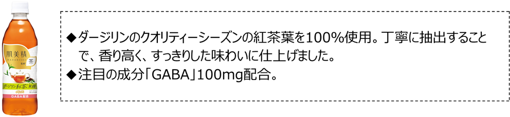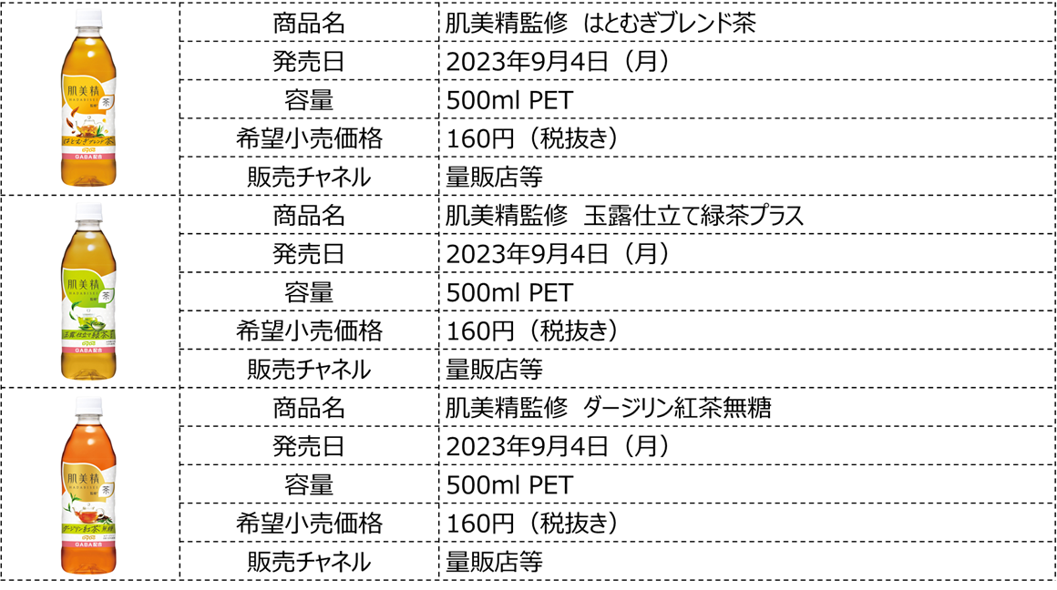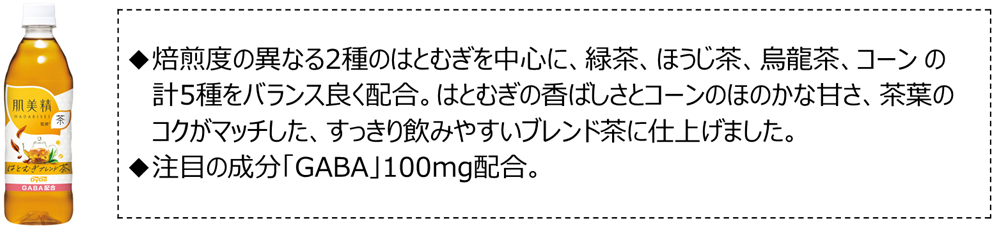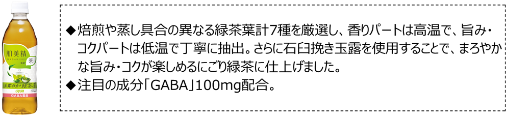 仕事中や家事の合間など、さまざまなシーンで、注目の成分「GABA」を100mg配合した「肌美精監修」の茶シリーズのラインアップを、ぜひお楽しみください。