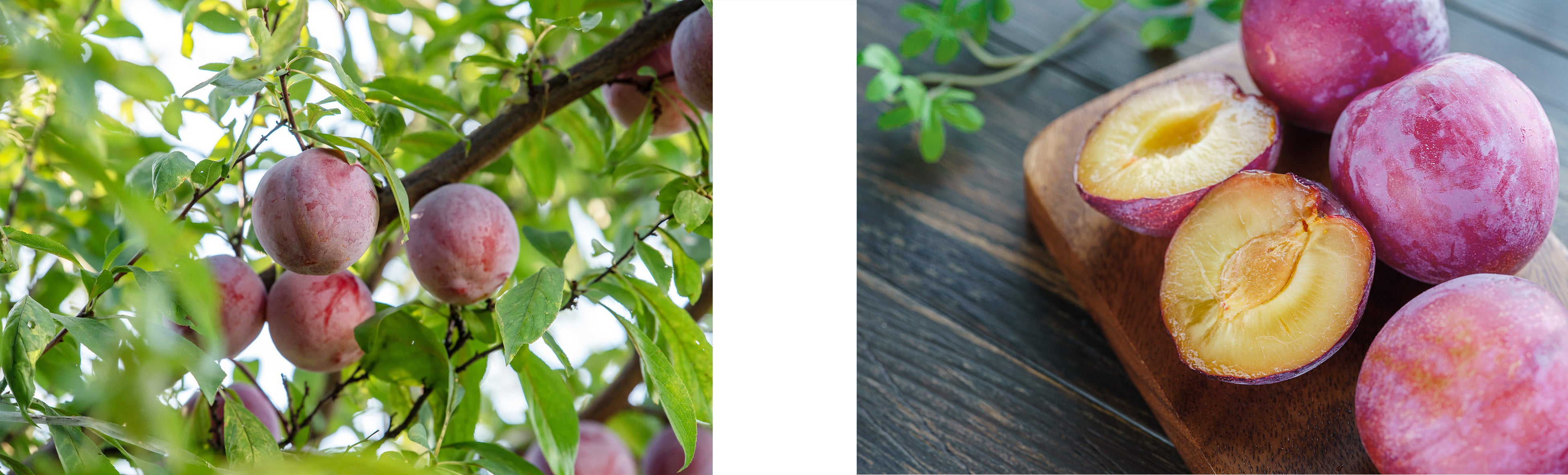 大石早生(オオイシワセ)、ソルダムに次いで多く作られている代表的なすももの品種です。この品種は山梨県で発見され、現在も全国の半分以上が山梨県で生産されています。産地にもよりますが、旬の時期は6月下旬から8月中旬頃までとなります。果皮の色は、濃い鮮紅色。表面にブルームと呼ばれる白い果粉が付いているものが質の良いものとされています。果肉は乳白色をしており、やや硬めで、果汁が多いのが特徴です。味の特徴として、すももの中では糖度が高く、特に完熟すると酸味がやわらぎ甘味が目立ってきます。