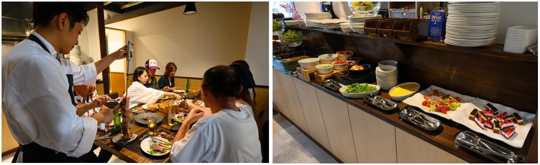 シュラスコ専用グリルで串に刺した塊肉をじっくり回転させながら焼くことで、肉汁を循環させ外に逃がさず、外側はカリっと香ばしく中はジューシーに焼きあげ、テーブルにて切り分け提供いたします。その味わいは、一度口にしたら忘れることのできない至高の贅沢といえます。沖縄の地元野菜をたっぷり使用したビュッフェと併せてお楽しみください。