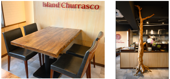 ブラジルの食文化と石垣の食材を融合することで、両方の特徴や個性を引き出し、食を通じて全世界のお客様が楽しめる、新たな価値の提供を世界に発信してまいります。(右:チャーギ 左:特注の琉球松テーブル)